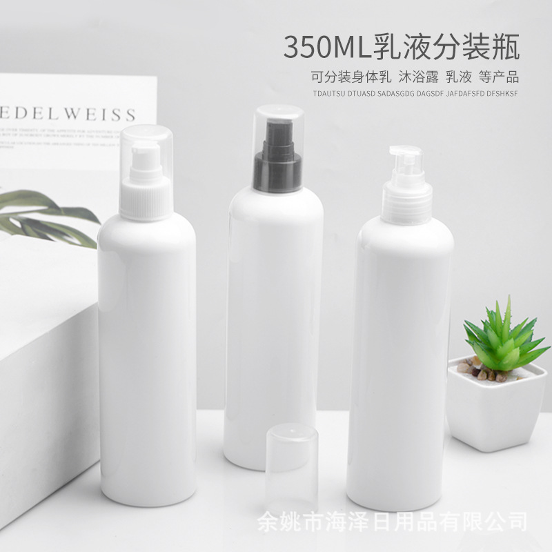 350ml丸肩ボトル24口プラスチックpetボトルにアヒルの口、全ppカバー粉ポンプボディ哺乳瓶ローションボトル