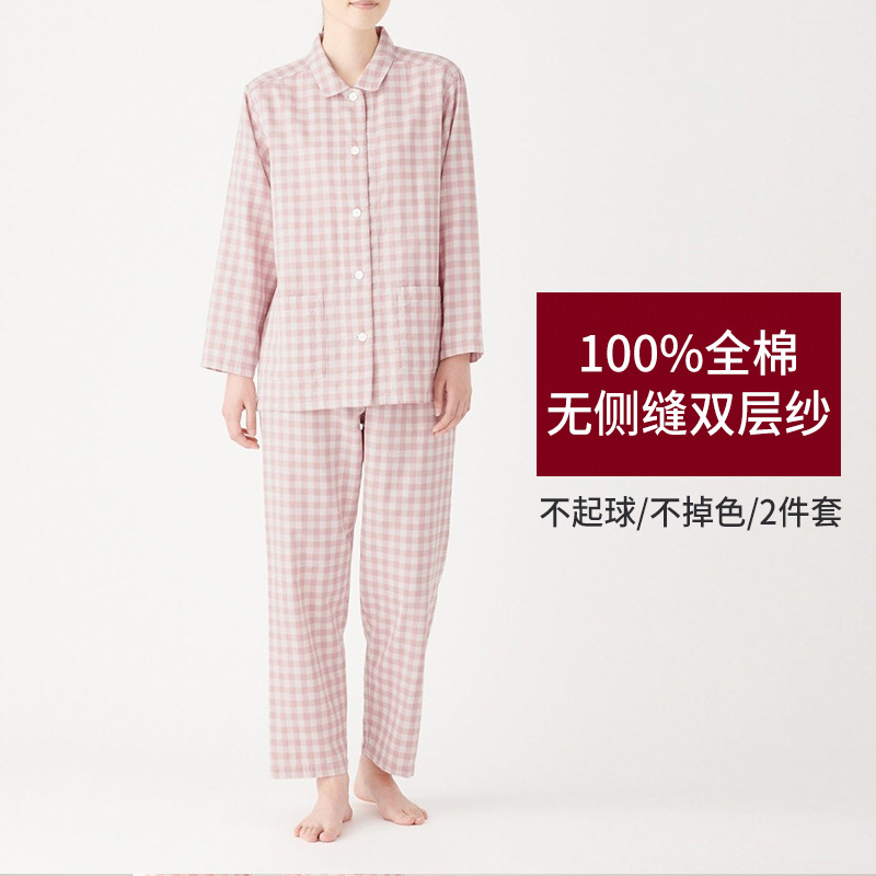 純綿春夏ホームウェアシンプル全綿品質日本式二重ガーゼパジャマ女性縫いなし男性長袖