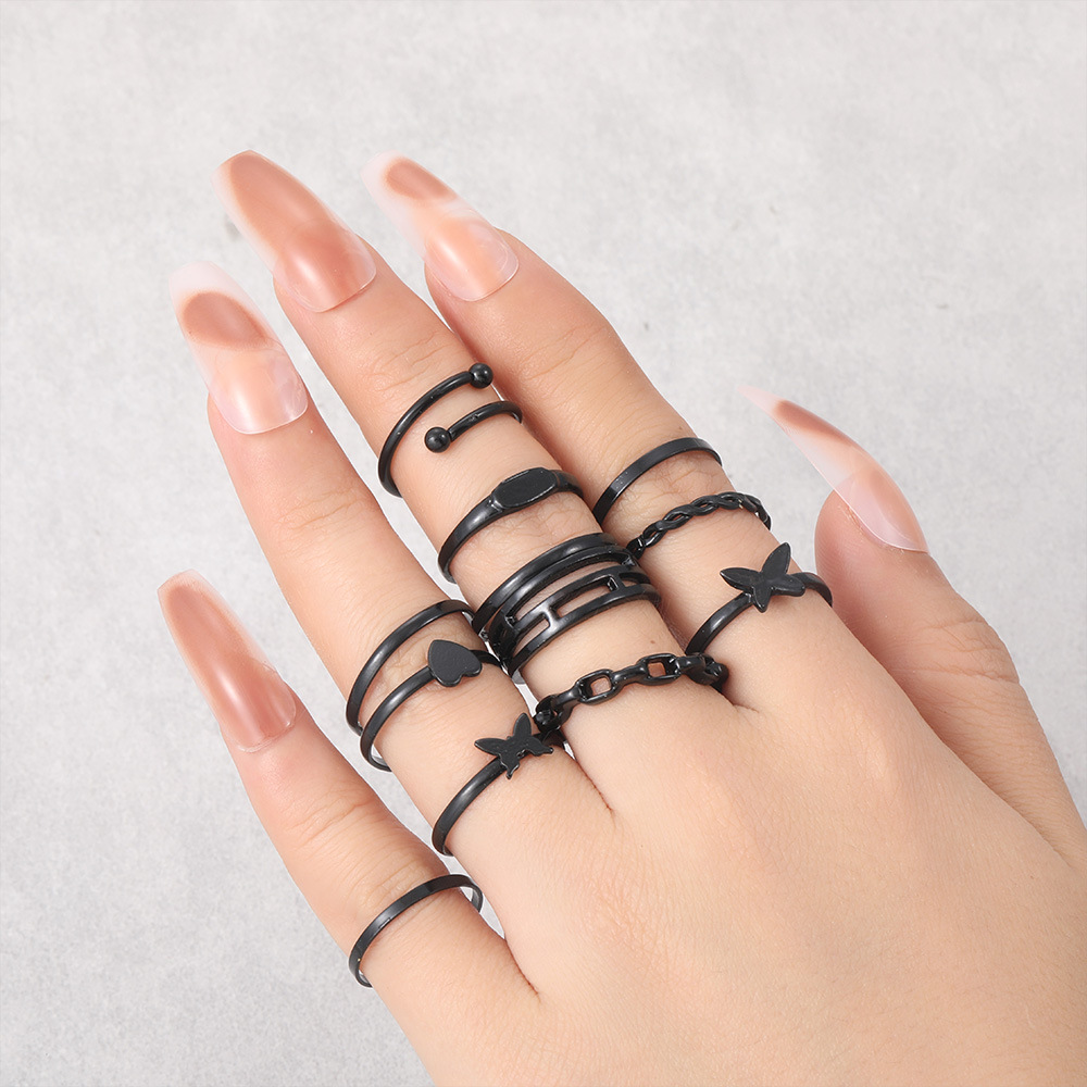 欧米の新型の組み合わせの指輪の個性の電気泳動の黒の愛の蝶のチェーンの開口部の12件のセットの指輪の装飾品