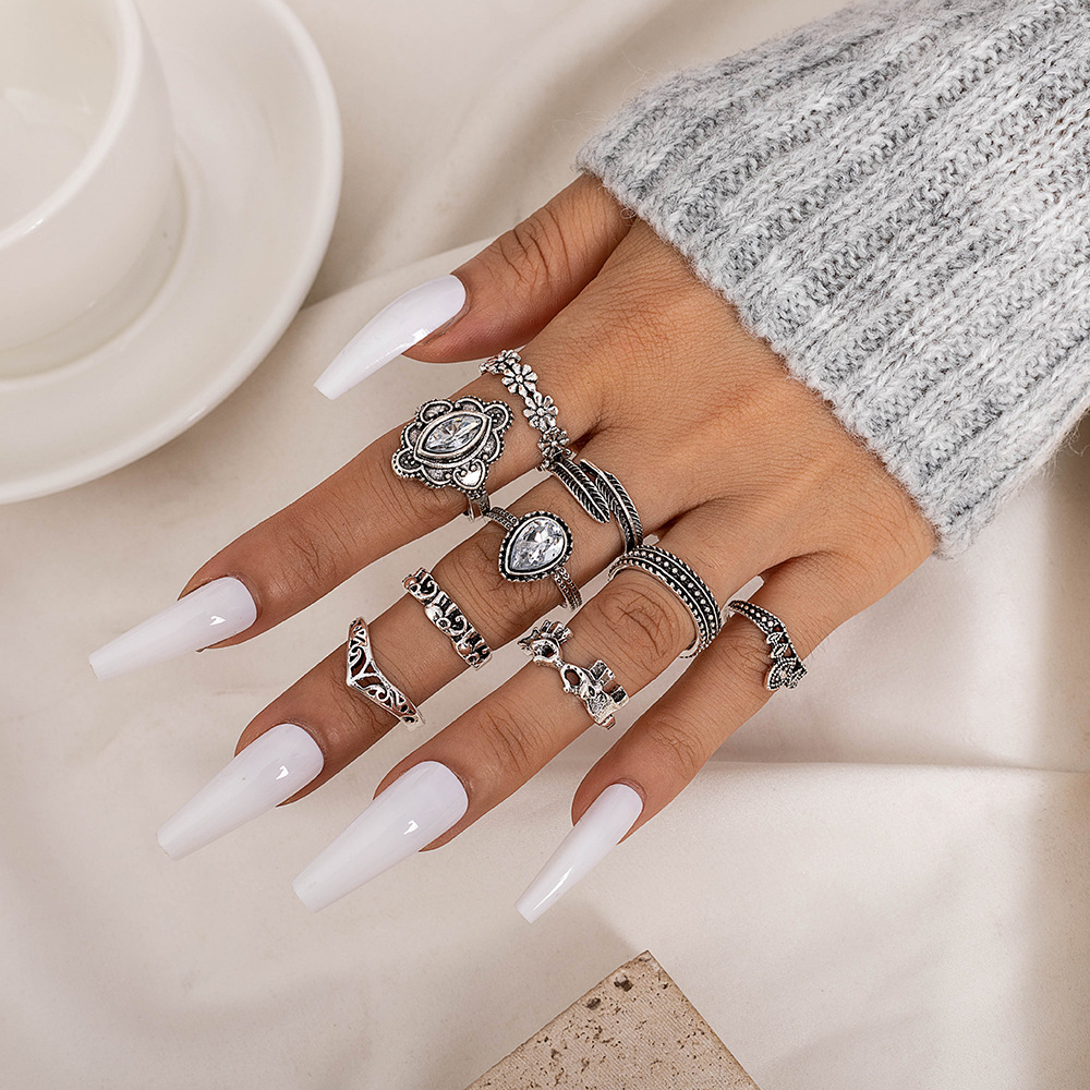 国境を越えたアマゾンの新しい指輪のレトロな点ドリルの花卉の羽の彫刻の開口部の9つのセットの指輪の卸売り