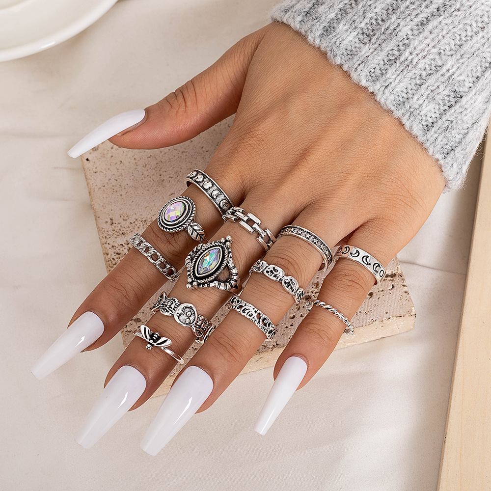 レトロな個性の多彩な水ドリルの麻の花のチェーンの透かし彫りの月の図案の12件のセットの指輪の卸売りの対外貿易は専用に提供します。