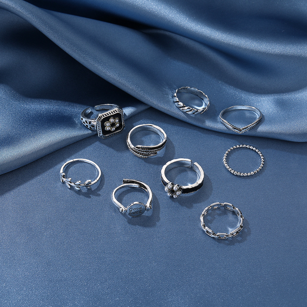 レトロな個性点小真珠英語good luck羽チェーン透かし口9点セット指輪卸売り