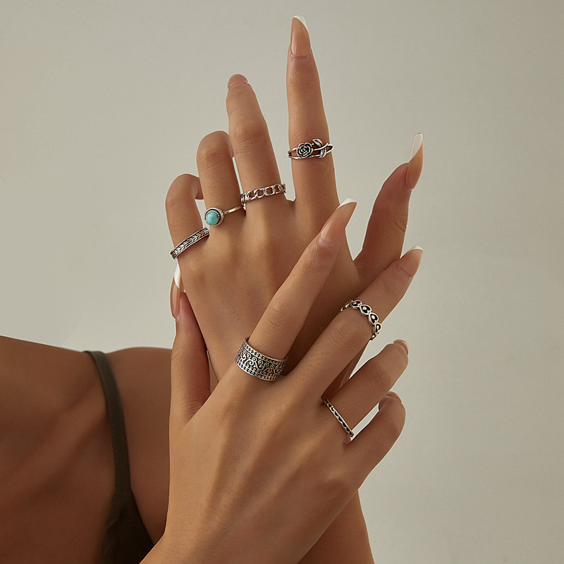 国境を越えて人気のある新しい指輪愛バラの透かし彫り指輪に松石チェーン模様の指輪を入れた7点セット