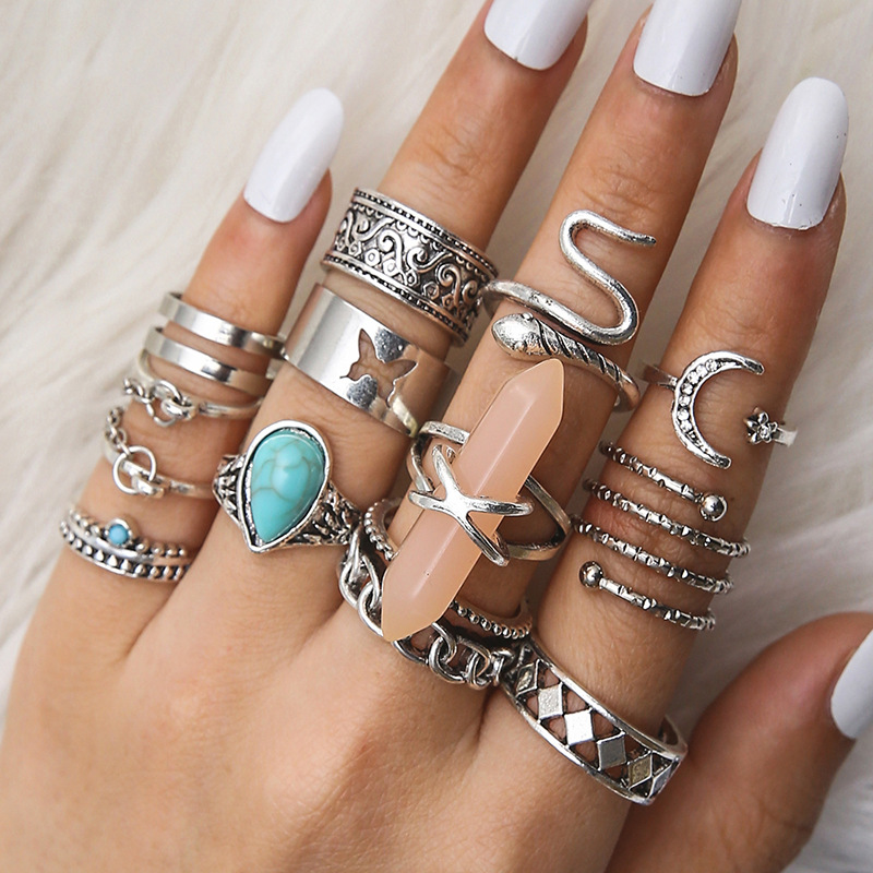 国境を越えた人気指輪欧米ファッションピンク六角柱松石蝶蛇形抜き12点セット女性卸売り