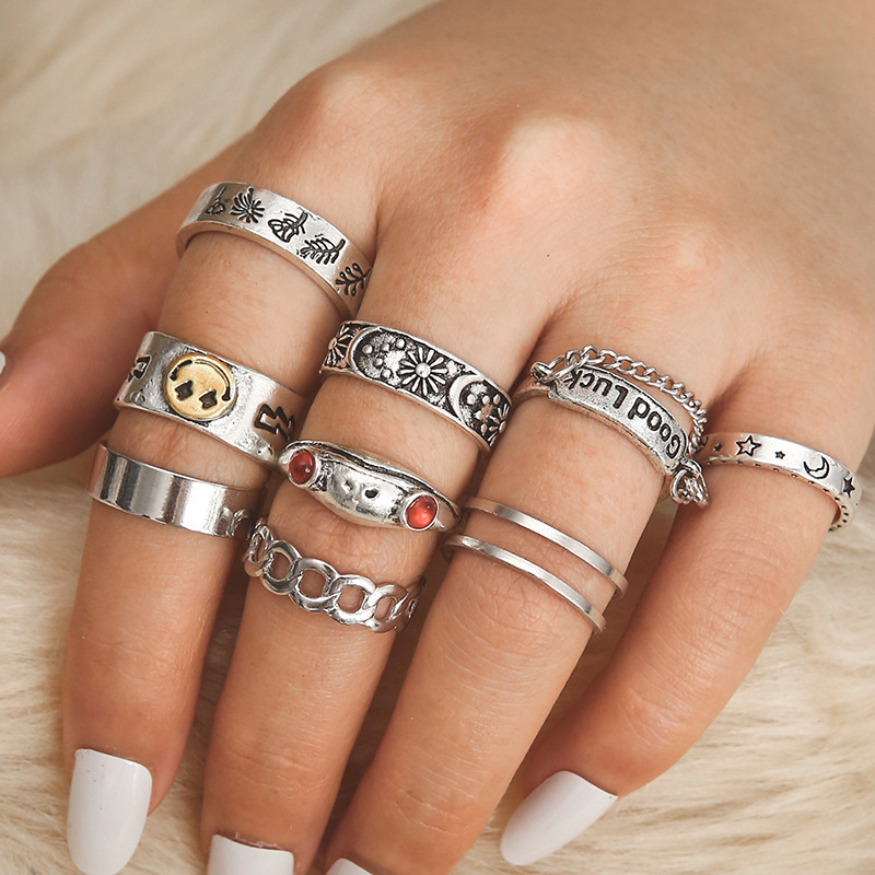 速売通の人気指輪のレトロでシンプルな英語のアルファベットgood luck麻花の開口部の組み合わせ10点セットの女性