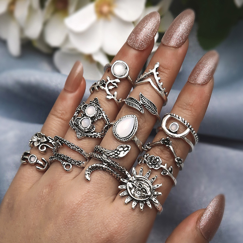 国境を越えた人気指輪ファッション真珠黒宝石指輪個性誇張象木の葉16点セット指輪女