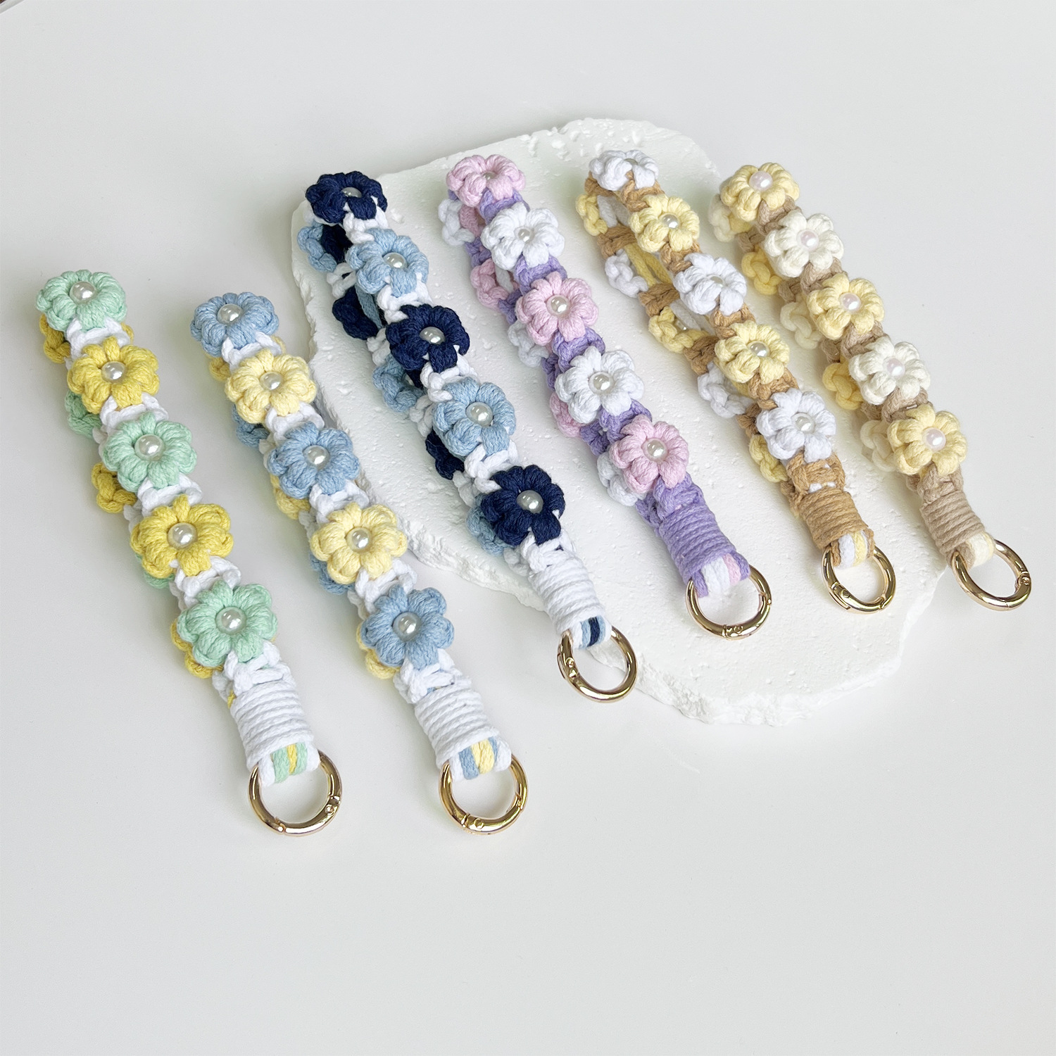 北欧の手編みの携帯チェーンのヒナギクの真珠の小さい花は芯の縄のキーホルダーを包みます。