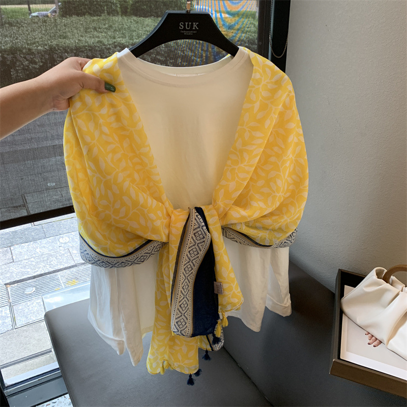 黄色の綿麻のマフラーのストールの両用の夏の新型のフリンジの薄いシルクのタオルの屋外の旅行の日焼け止めの大きいビーチのタオルの女性