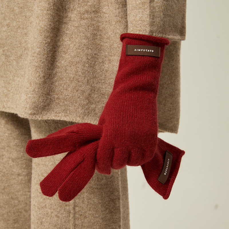 秋冬保温insソフトモチモチ純色レースウール手袋女性冬保温ニット五本指タッチパネル可能手袋