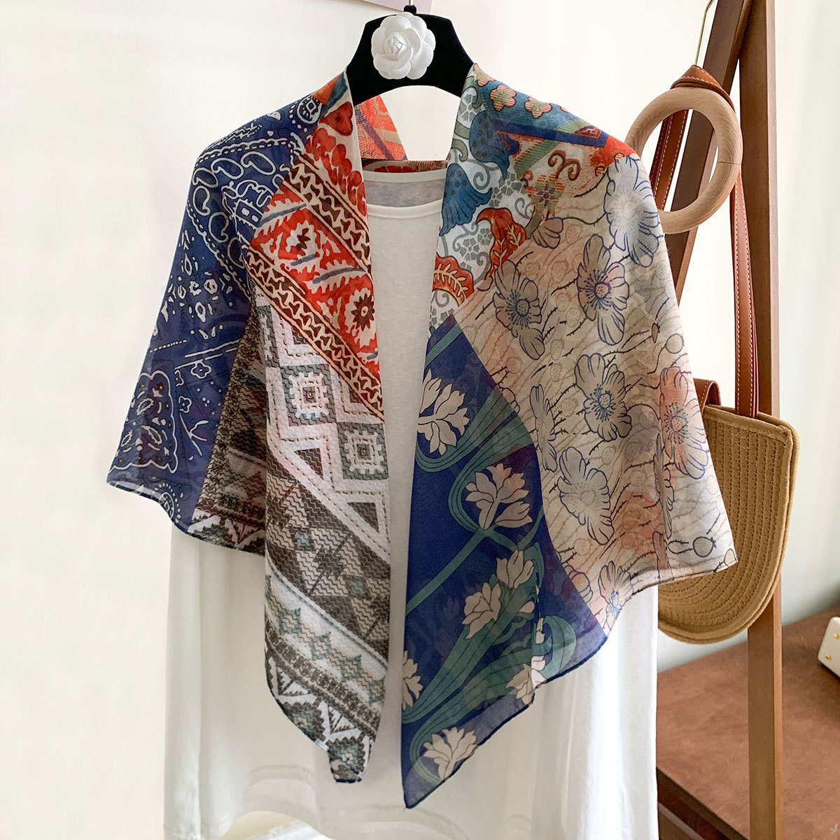 [110*110 多用途日焼け止めショール] フレンチレトロプリントスクエアスカーフ女性用夏ハイエンドシルクコットンスカーフ