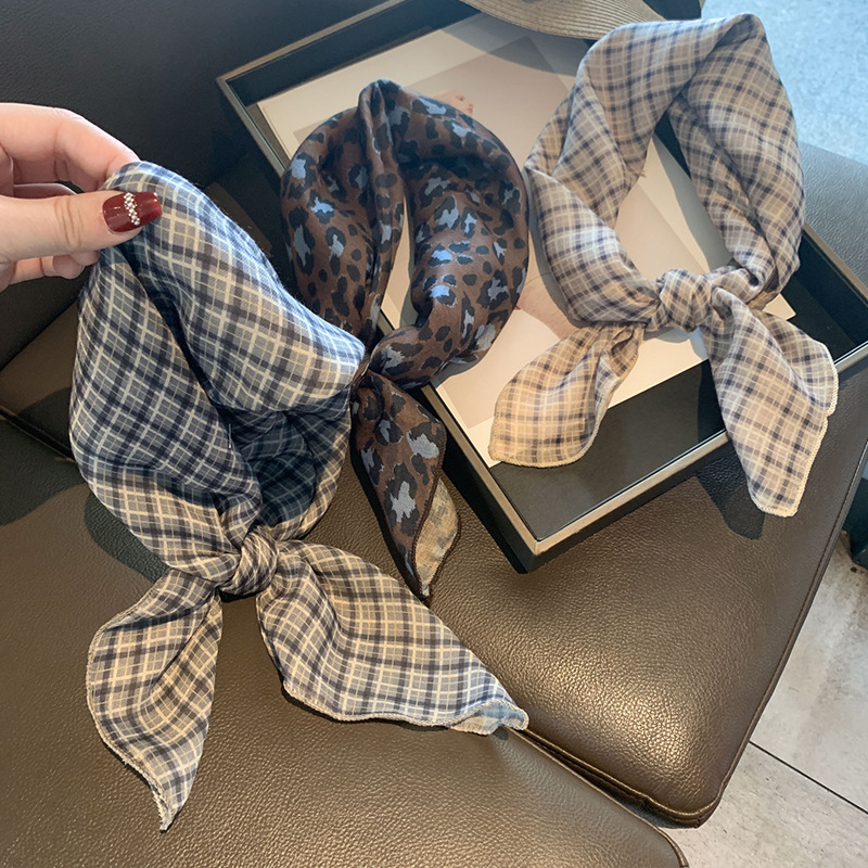 2025春の新作のストライプの格子のプリントの小さい方のスカーフの女性の夏の写真を撮って韓国版のスカーフの頭を飾ります。