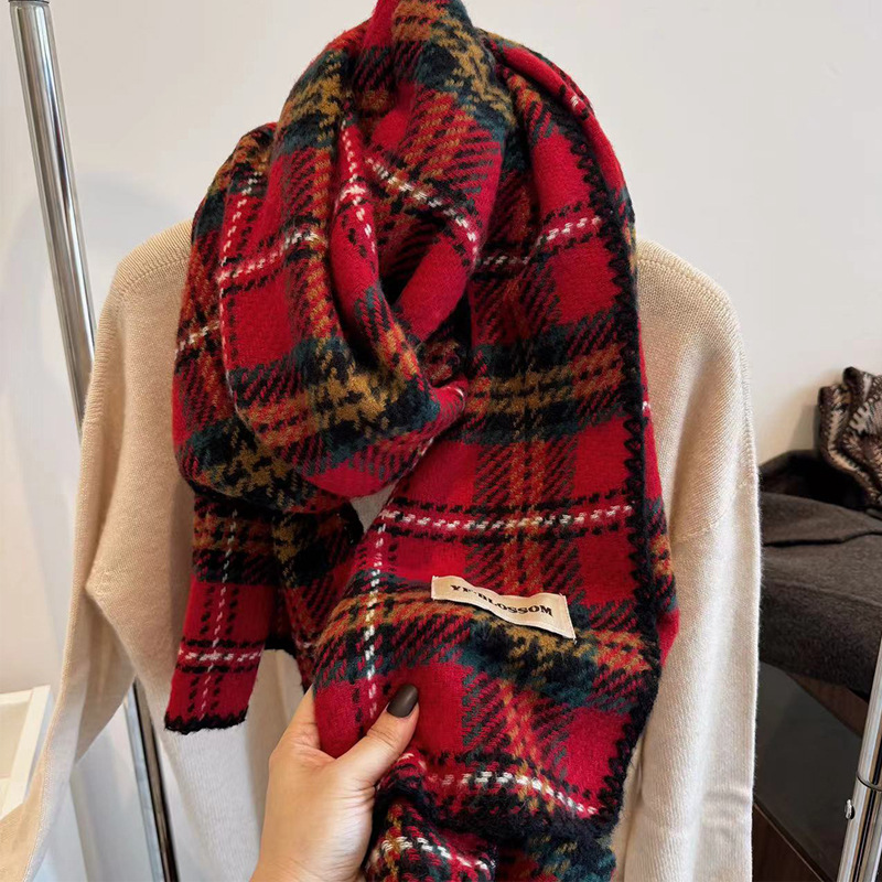 2024新型韓国格子縞ウールマフラー女性冬復古百合千鳥格子防寒保温マフラー