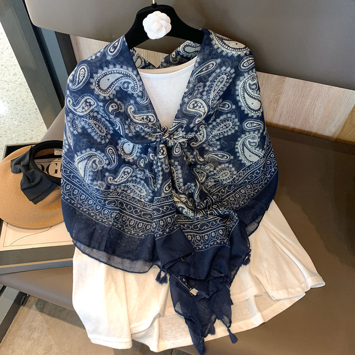 【ネイビーカシューナッツ-タッセル】綿麻新中国風多用途おしゃれエレガントショールスカーフ春夏日焼け止めショール