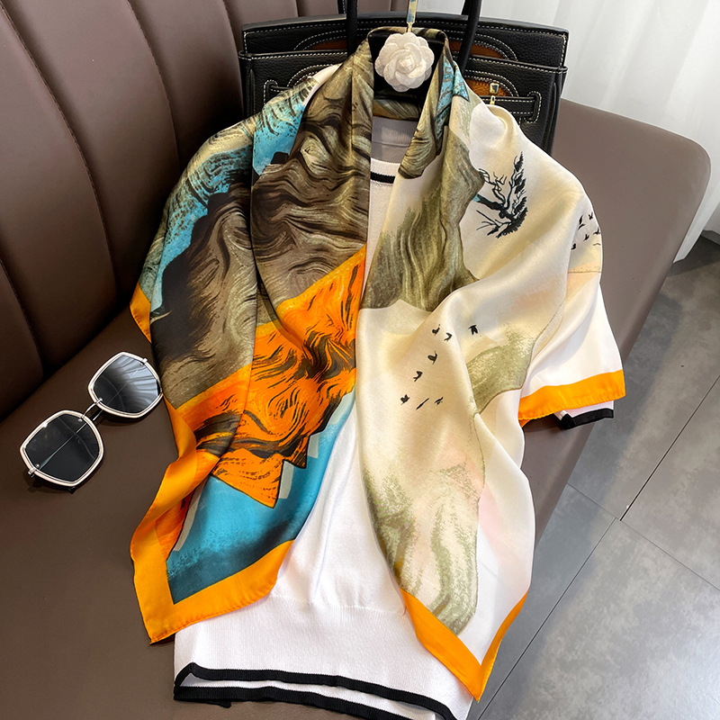 2024年新作シルクスカーフ レディース 四季通用 おしゃれ 風景画 ヴィンテージプリント スカーフ 90cm スカーフ ネックウォーマー