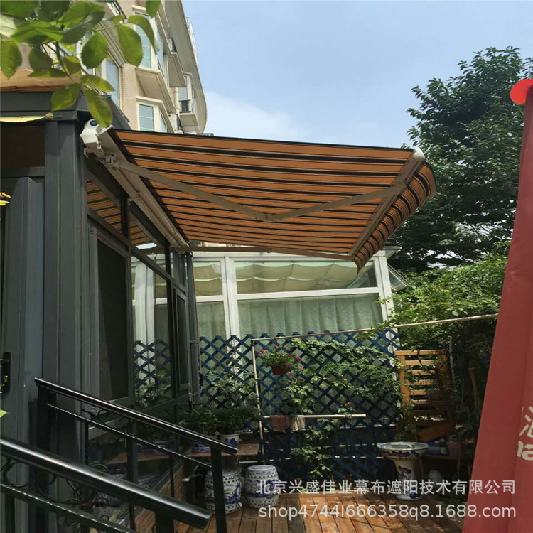 安慧橋伸縮式日除け店の門口屋外ベランダの電動手が折り畳み式伸縮式雨よけ棚を揺らします。