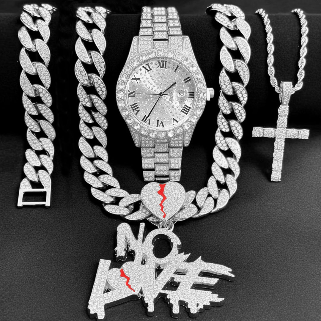 クロスボーダーホットヒップホップクォーツカレンダーメンズウォッチ菱形キューバブレスレットセットダイヤモンドクロスネックレス