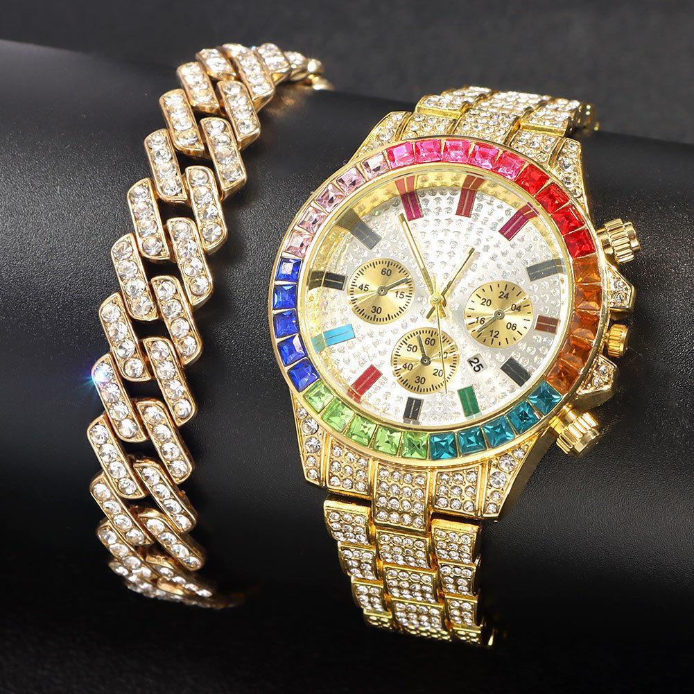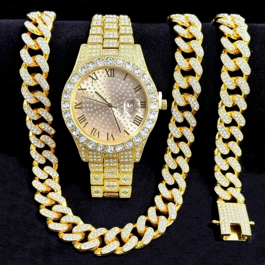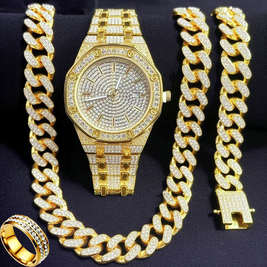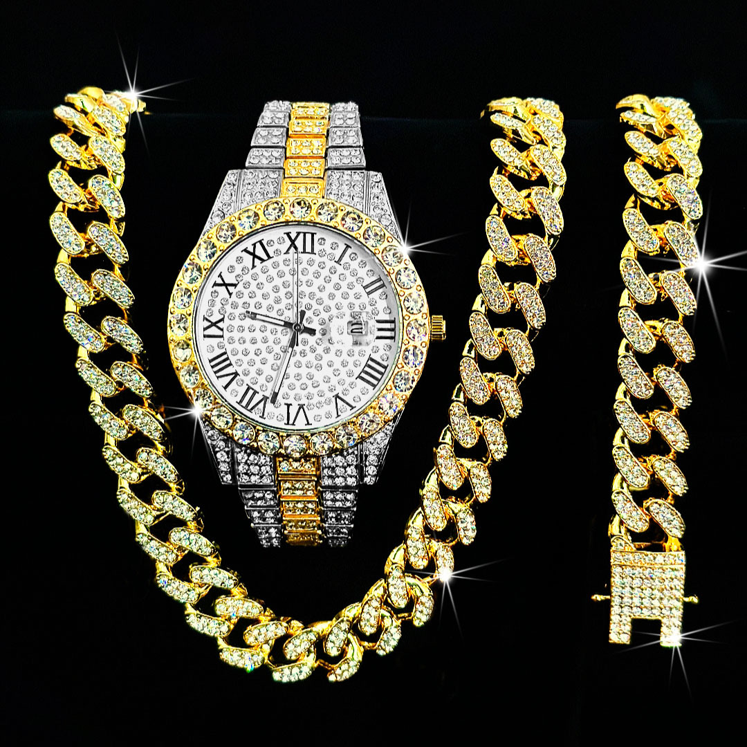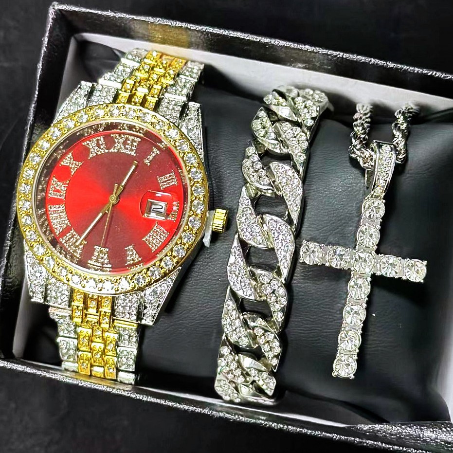 クロスボーダー貿易 マンティアンシン スチールバンド ダイヤモンド付き ヒップホップ カレンダー メンズ腕時計セット キューバンチェーン 3点セット腕時計