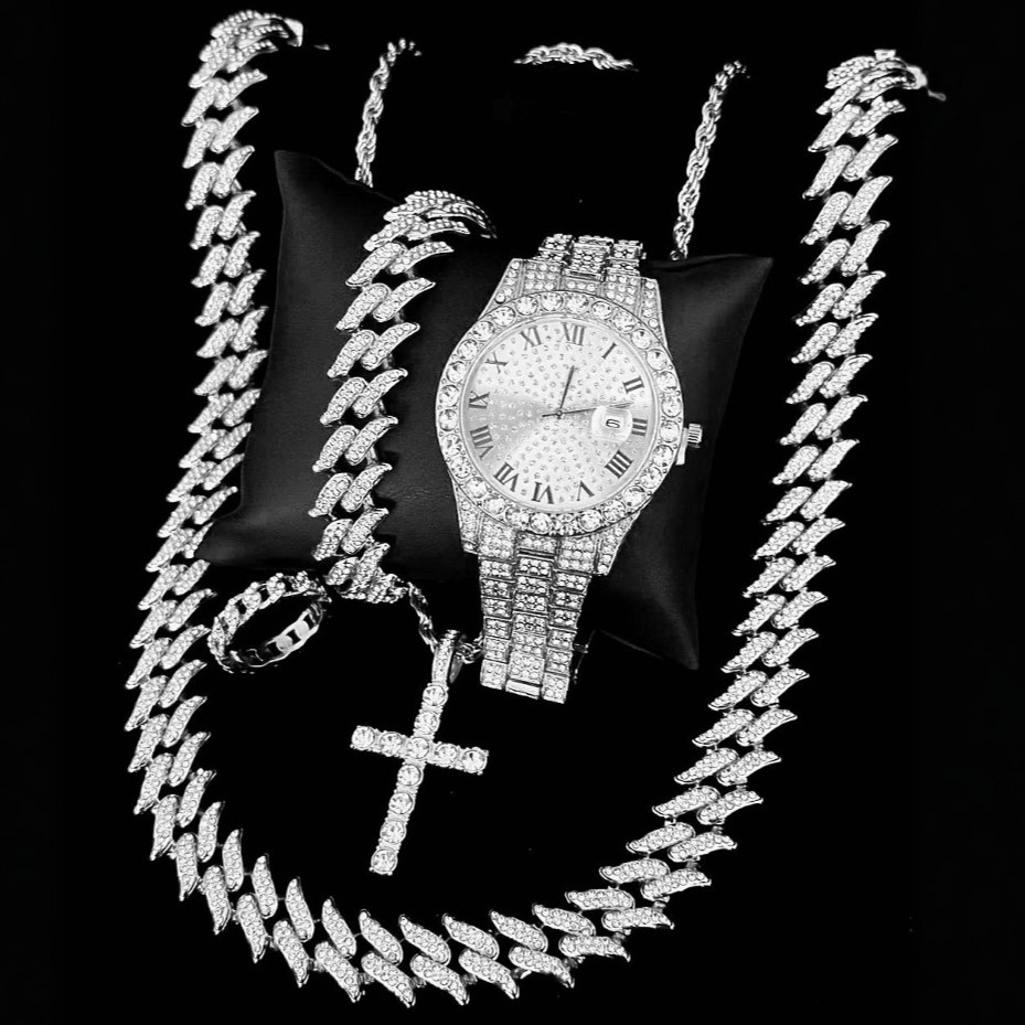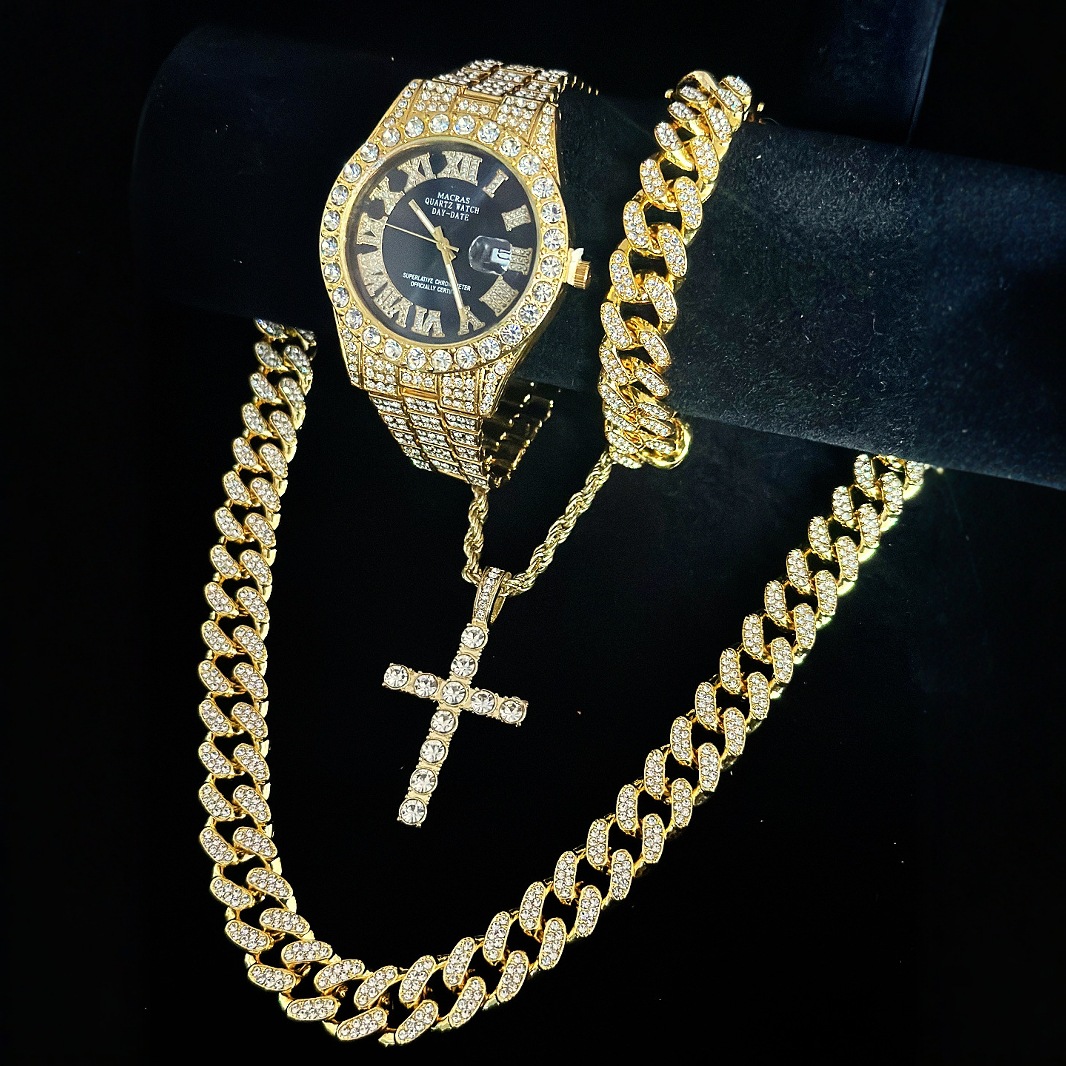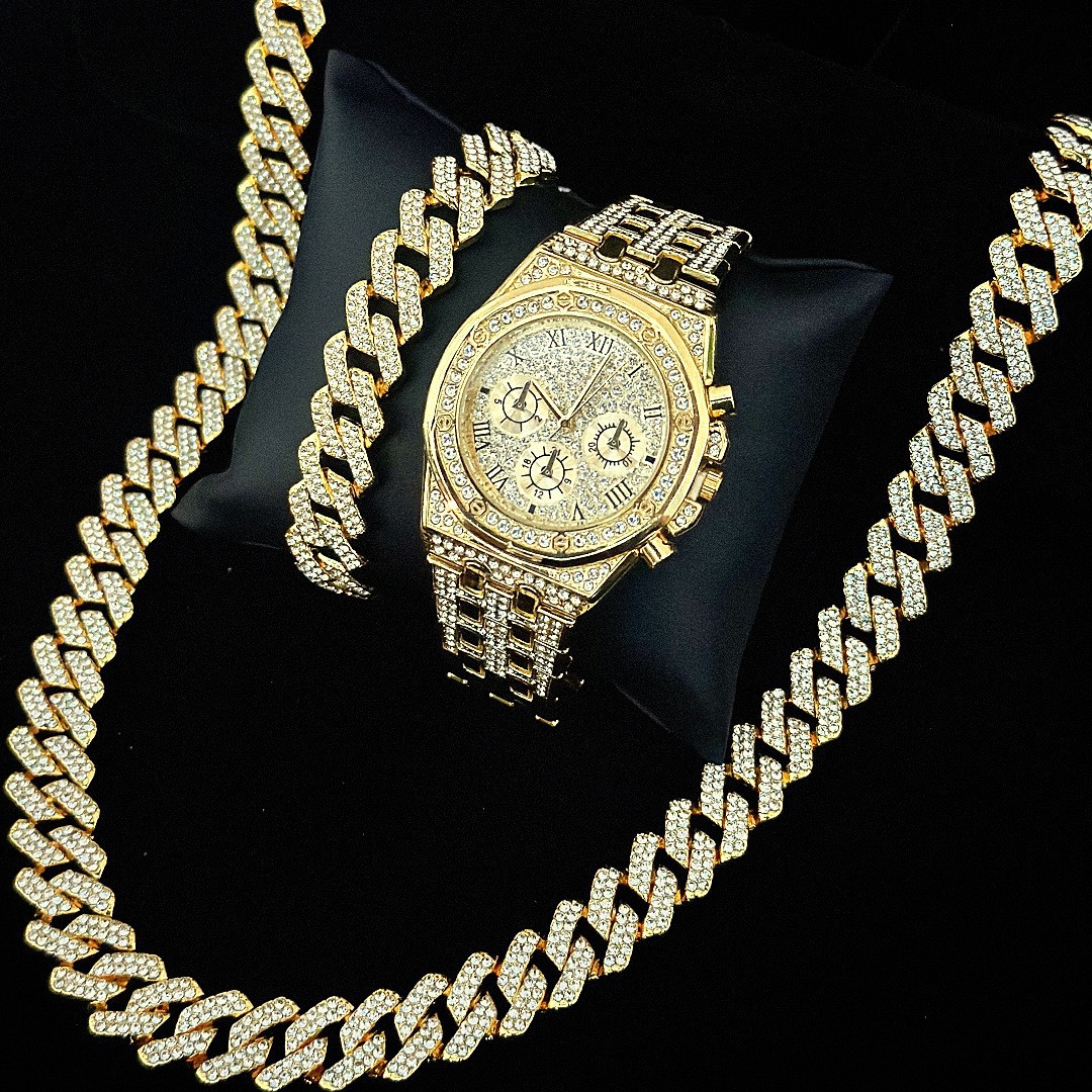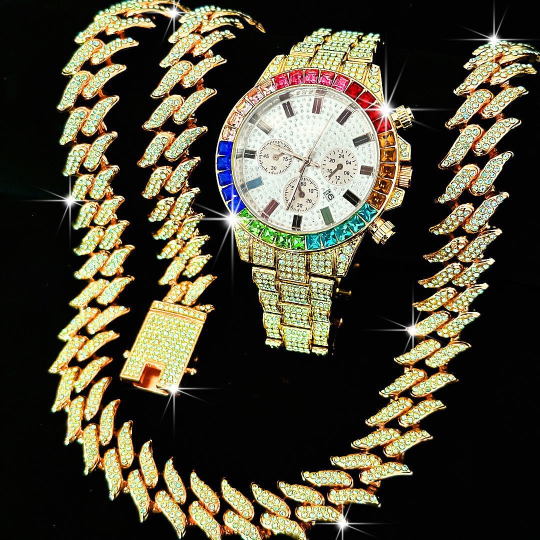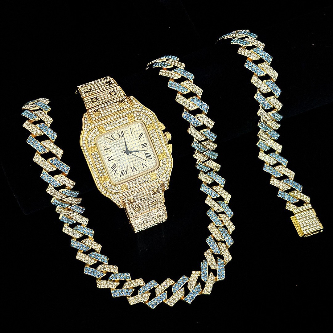 ファッションのヒップホップスタイルのチェーンがいっぱいです。腕時計にはダイヤモンドのブレスレットのネックレス (3pc/set) が入っています。