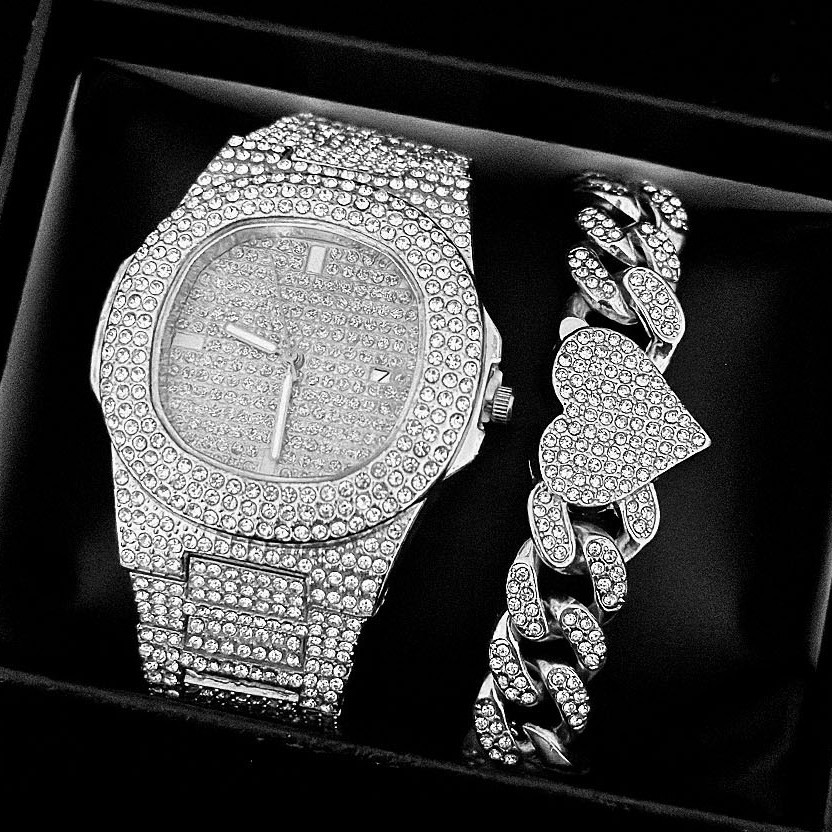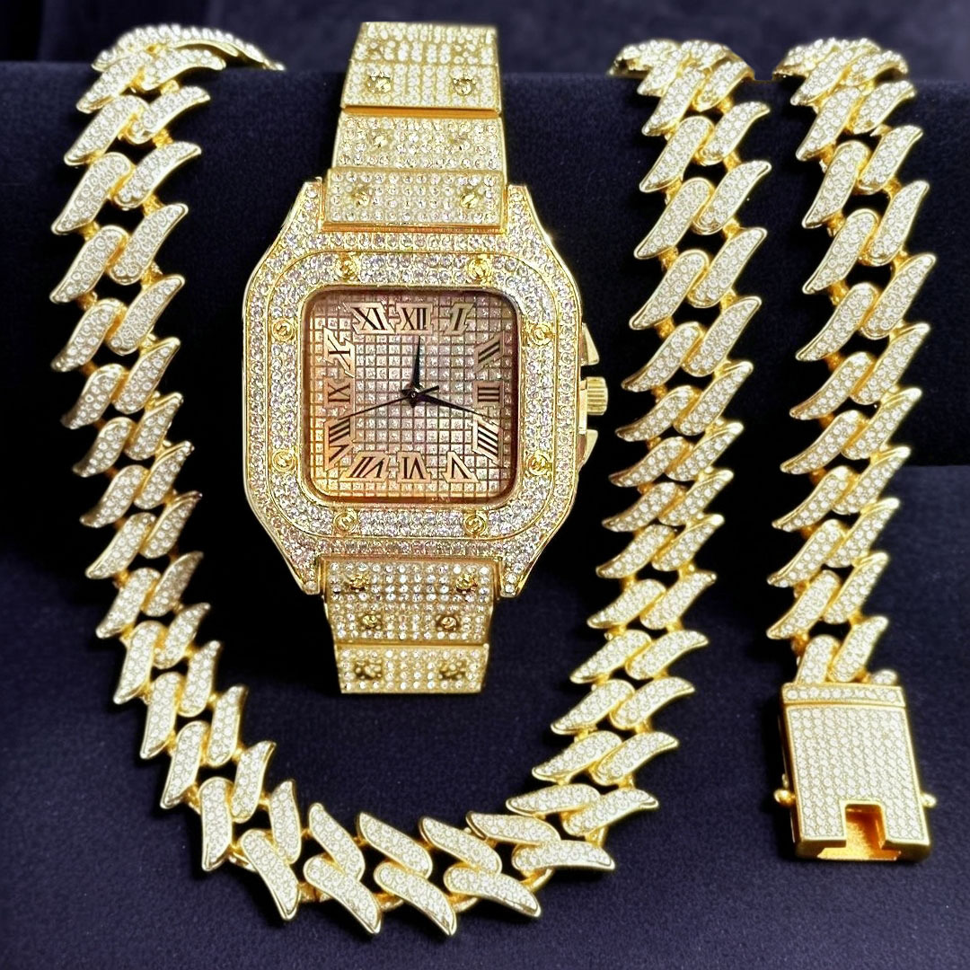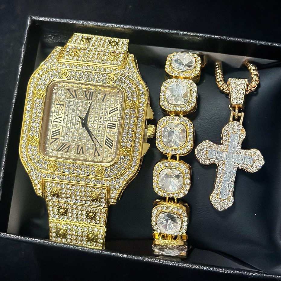 TEMU爆型ダイヤモンド石英腕時計ヒップホップ腕時計ブレスレットネックレスセットファッション人気腕時計プレゼント