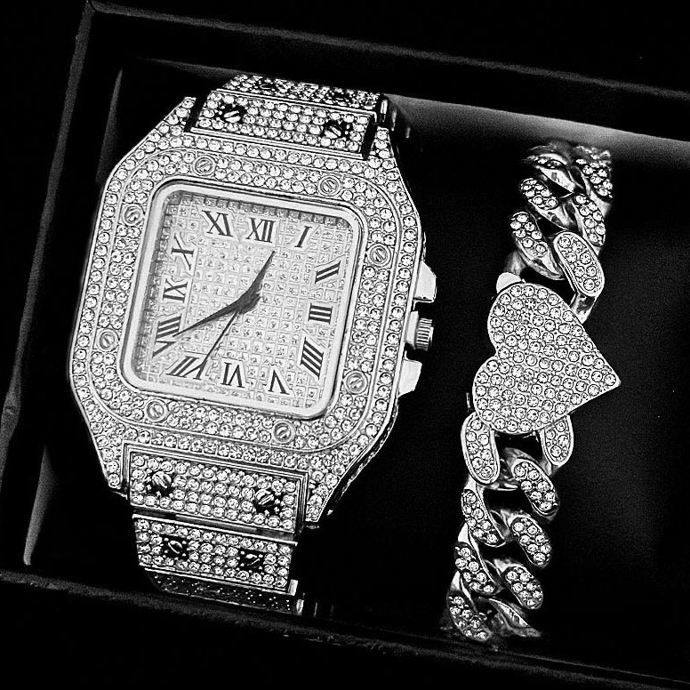 フルダイヤモンドローマ文字盤スチールバンドウォッチ、ベビーブレスエッジ気質ビジネスクォーツウォッチ、ヒップホップスタイルフルダイヤモンドブレスレットセット