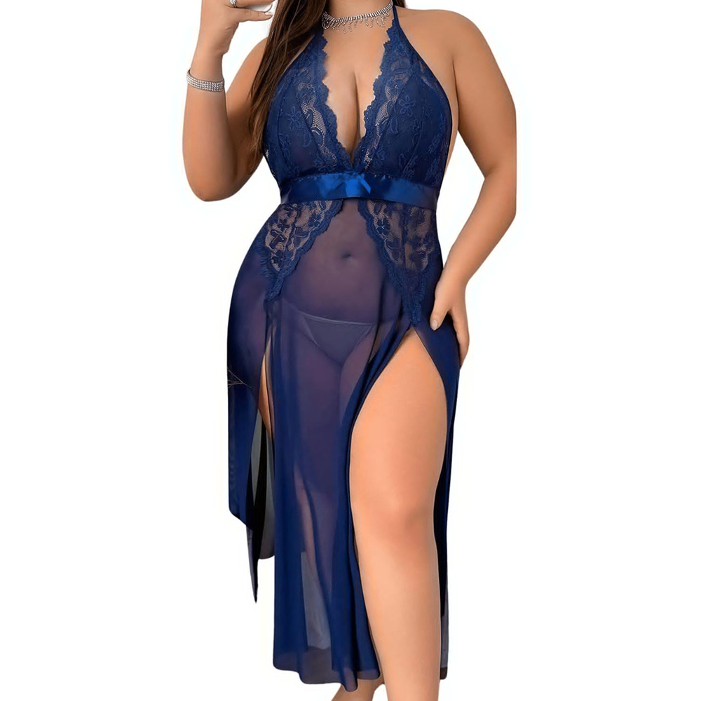 欧米のクロスボーダーアマゾンの新型の首のレースの長いスカートのセクシーな透視ネットの紗は大きいサイズの部屋の服の下着をつなぎ合わせます。
