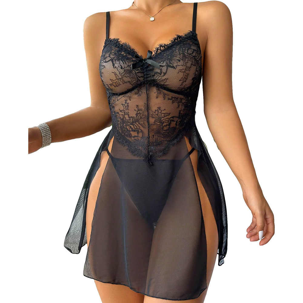 2024年の新型欧米の婦人服の蝶結びの装飾の趣味の下着のレースのネットの糸の通気性の薄いタイプのタイトなパジャマ