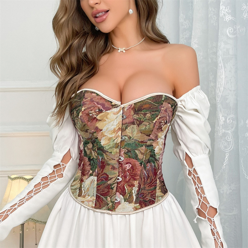 レトロな宮廷のピンクの小さい花の束ねの服はカップの魚の骨の胸の服の女性の美体を持って腰を束ねて身の上着を作ります。