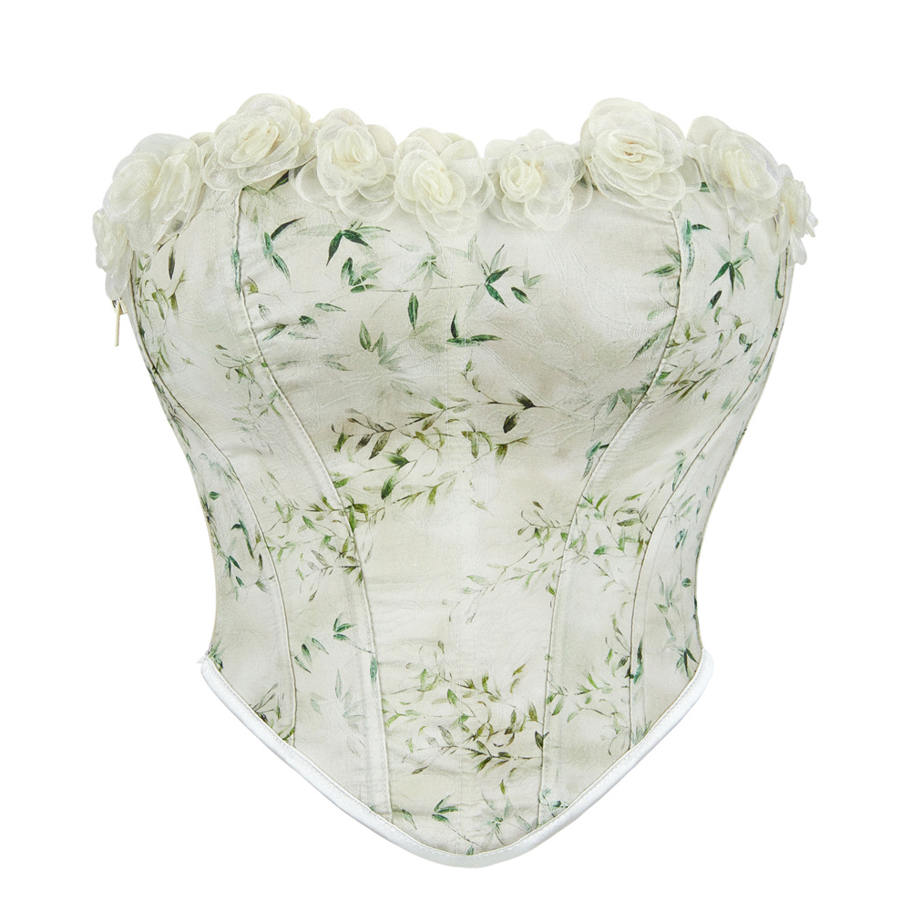 プリントの米の白い女性は胸を拭いて集まって胸の宮廷を支えて身の服の立体の花の王女の風のファッションの魚の骨の胸の服を作ります。