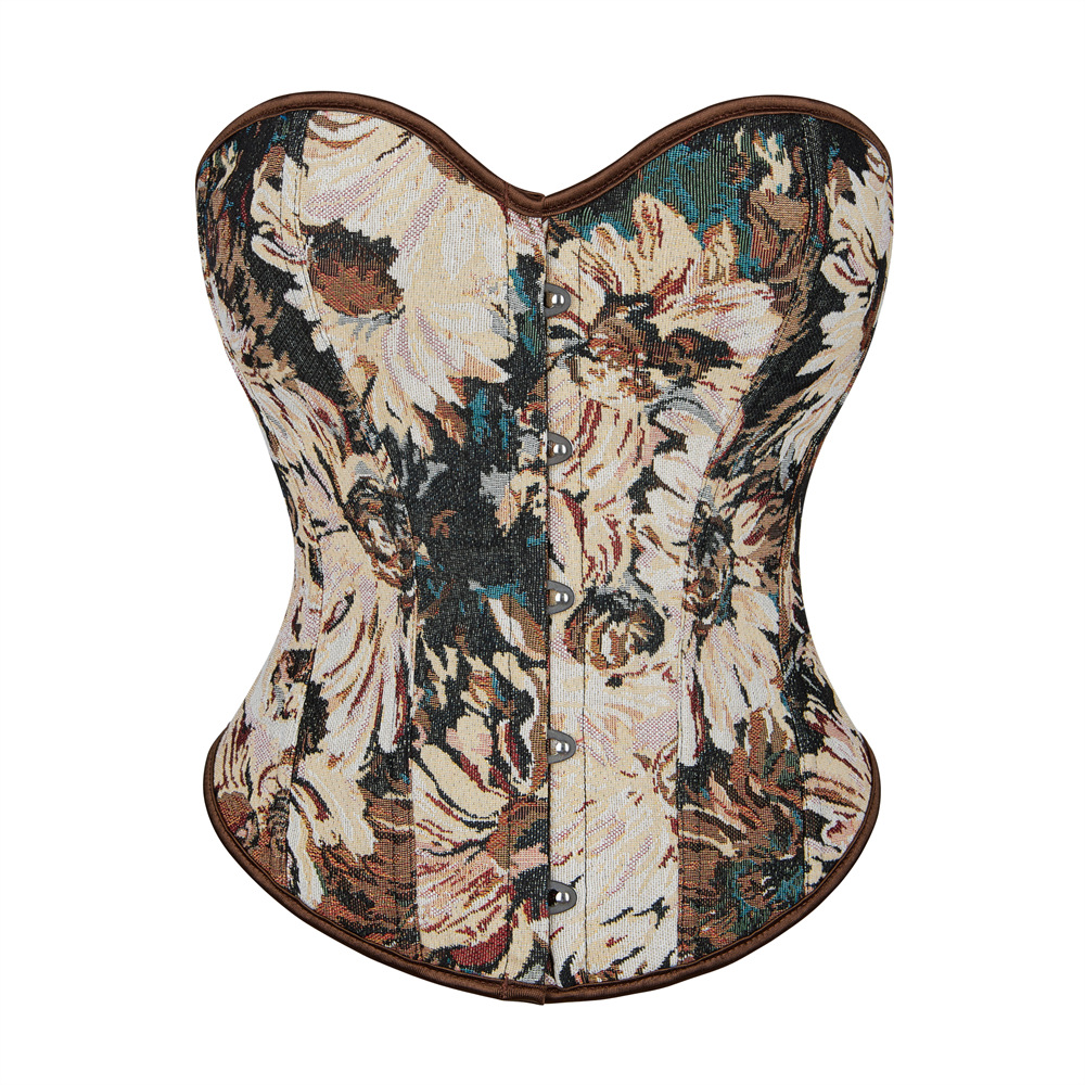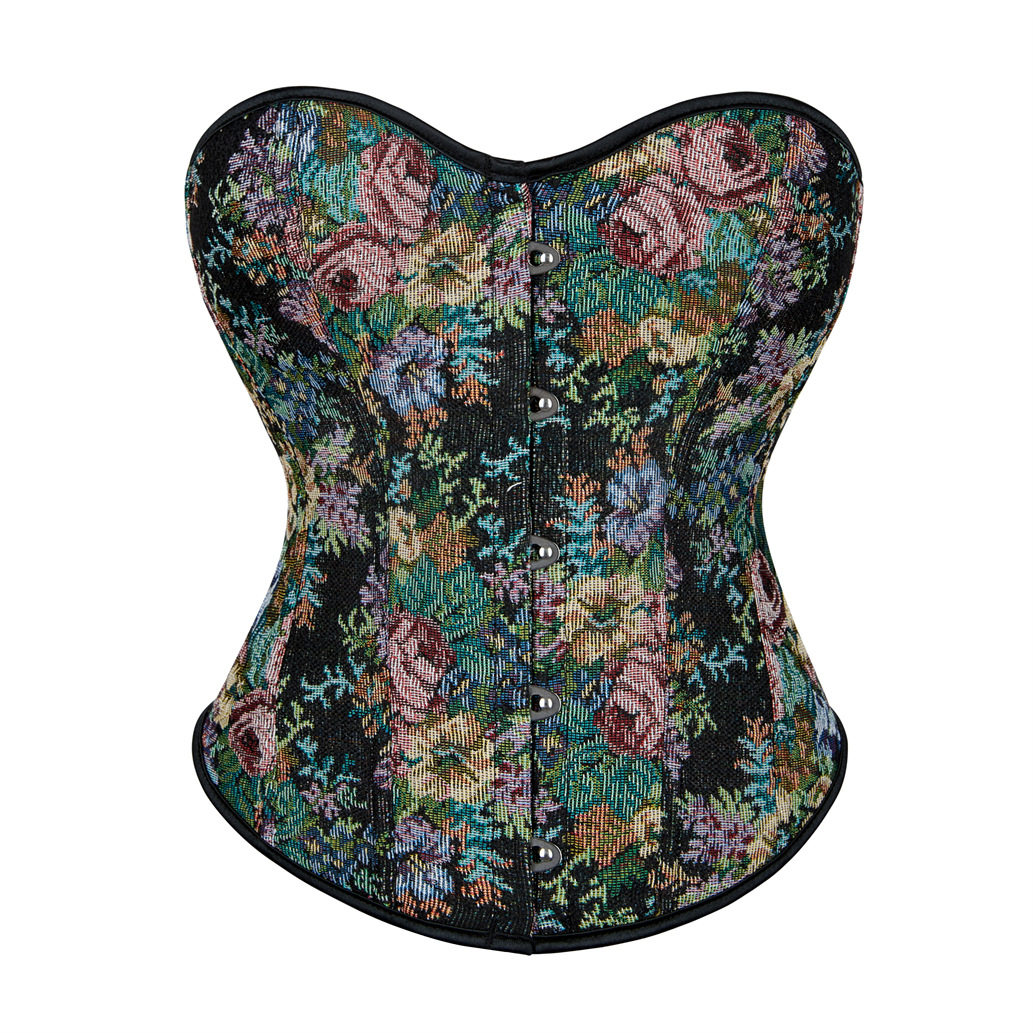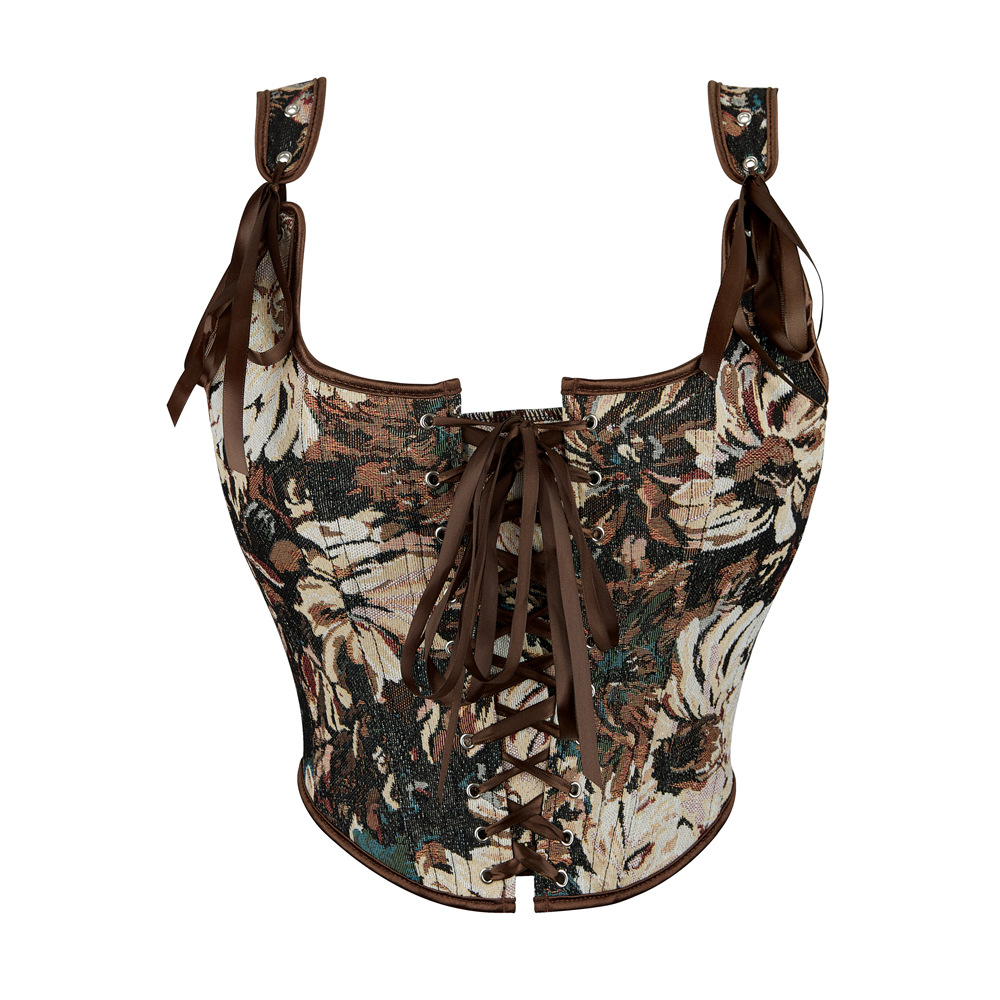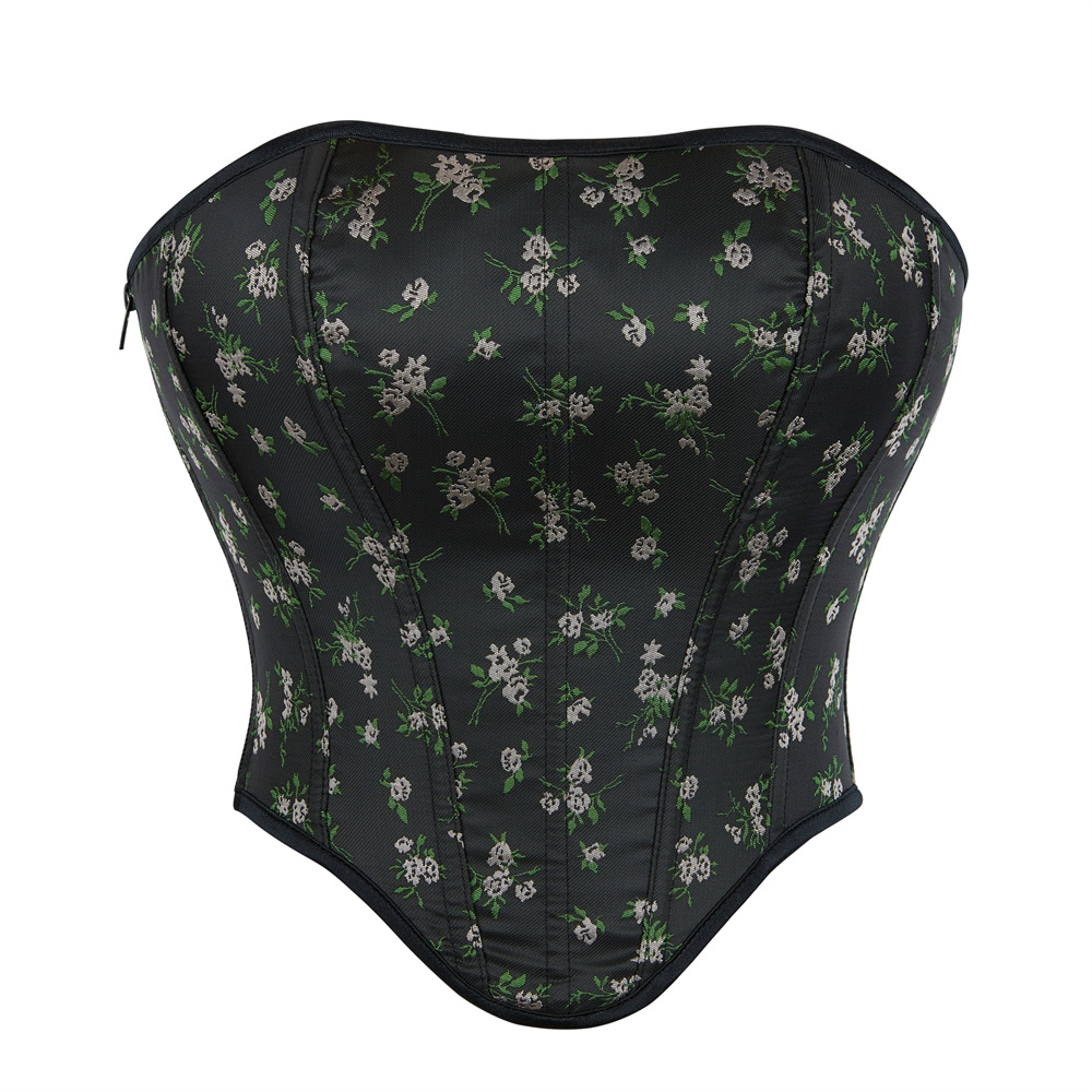 2024欧米の宮廷のレトロなボディスーツは肩ベルトのセクシーなシェイプアップの上着の黒色の植物のプリントは腰の骨の服を収めます。