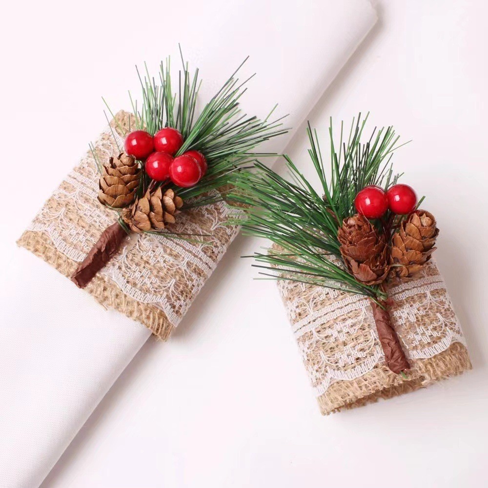 アマゾンの人気シミュレーション5個のあずき麻のリボンクリスマスの飾りのナプキンリングのシミュレーション松の針の花束の部品