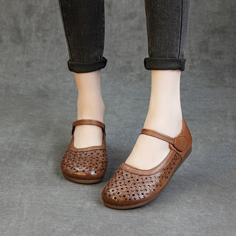 第一層牛革中空フラットサンダルソフトソールラウンドトゥマザーズシューズ2025新作本革メリージェーンシューズ