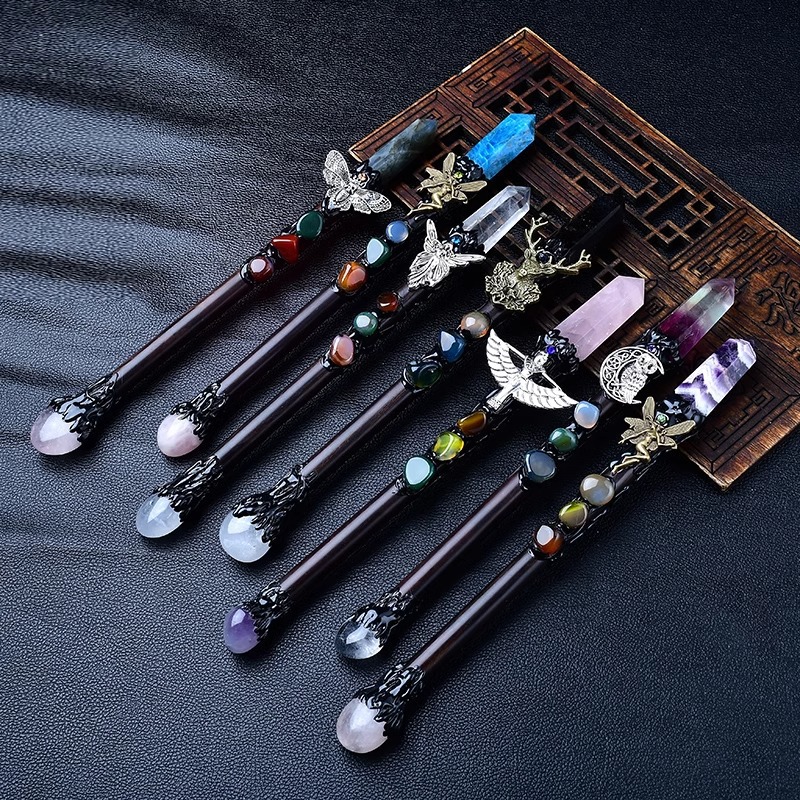 ナチュラルホワイトパウダーアメジスト六角柱魔法の笏装飾品ハロウィン妖精の杖宝石杖木製杖