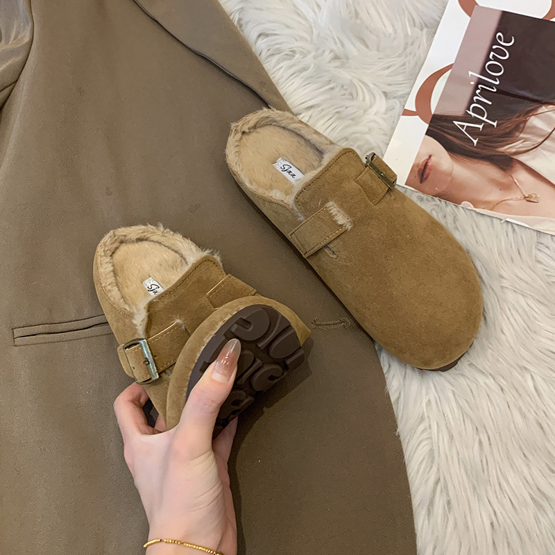 厚い底の皮の布のベーケンの靴の女性の毛のスリッパの2024の新型の秋冬の1足は頭の半分のスリッパを踏んで、ベルベットの綿は引きずっています。