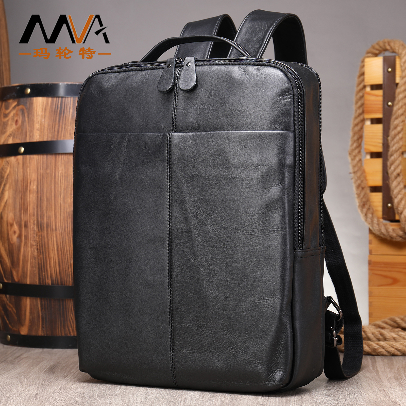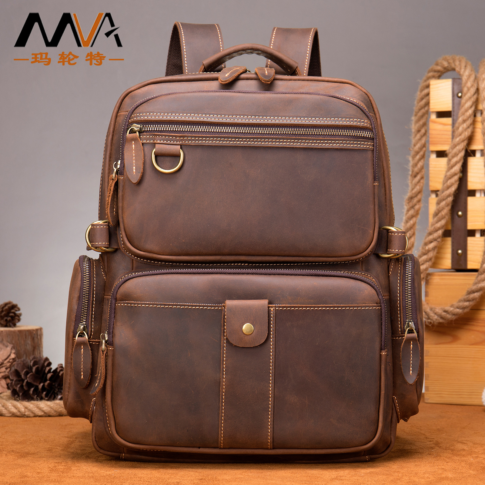 Mvaの新型男性は色の本革のリュックサックのレトロな15.6インチのコンピュータは木の膏の皮の頭層の牛革のリュックサックを包みます。
