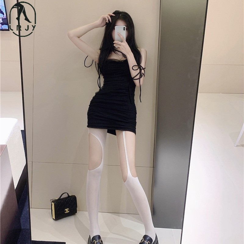 非対称ストラップ黒ストッキングの子供のセクシーなサイドに穴を開けて穴を開けます。