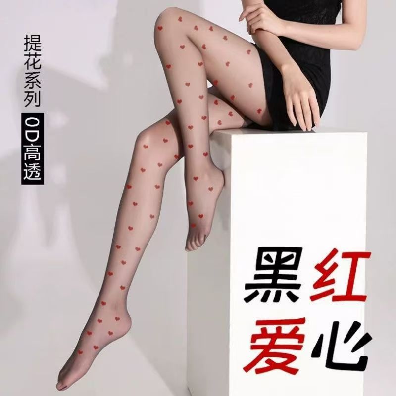 赤いハート柄の黒いシースルーストッキング、女性用夏用薄手、素肌のような肌触り、美肌効果、引っ掛かりにくいワンピースストッキング、パンスト