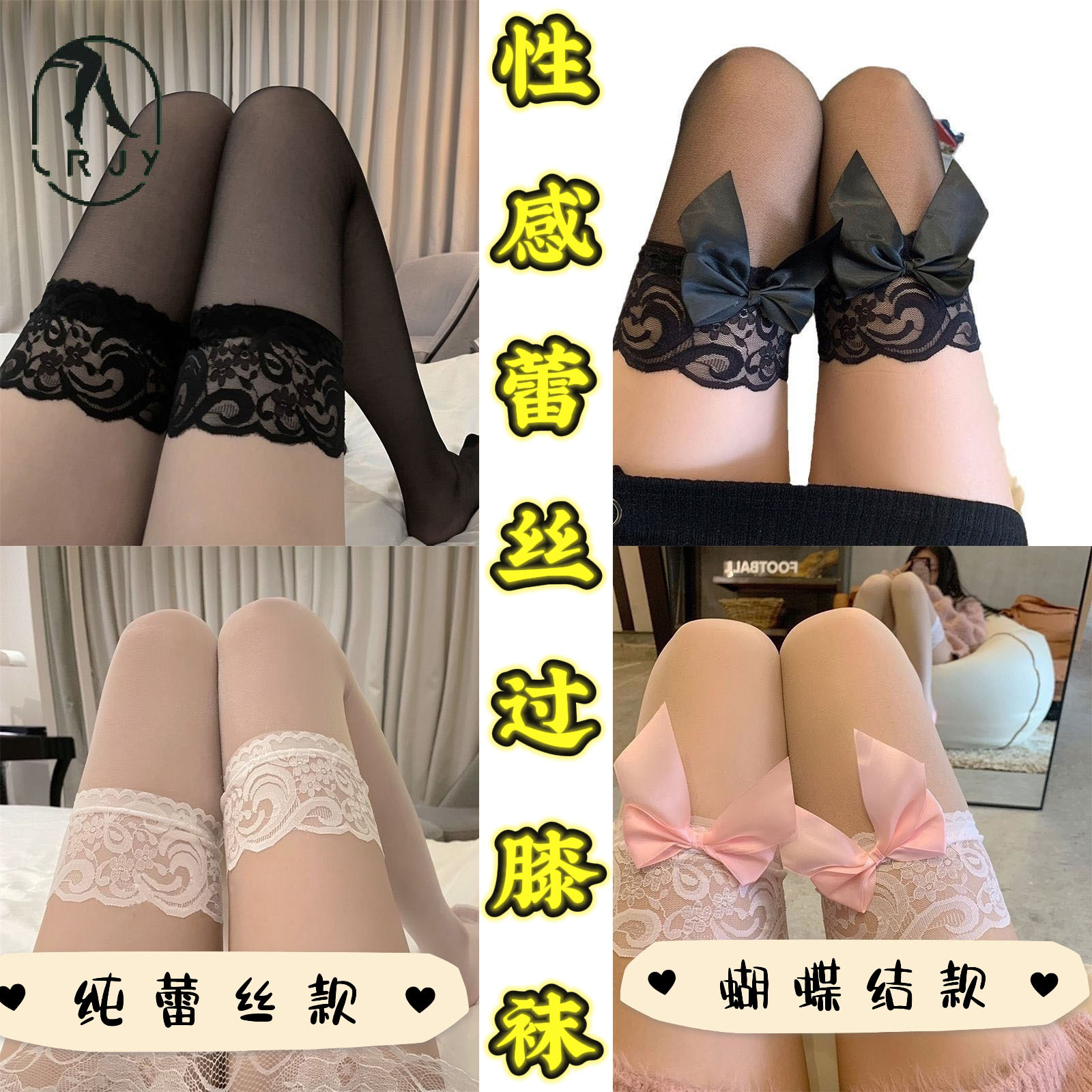 純粋な欲望のストッキング、レース縁のオーバーニーソックス、ショート丈の夏用薄手ストッキング、女性用蝶結びロングソックス、黒のストッキング、オープンタイプ