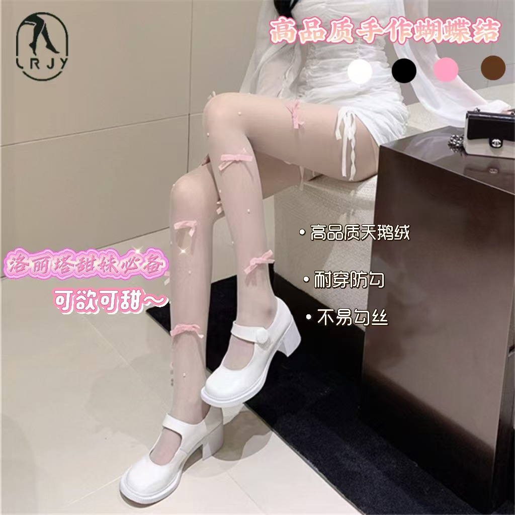 純粋な欲望の真珠のリボン付きストッキング、甘いストッキング、白いストッキング、ロリータストッキング、女性用超薄型ストッキング、自由にカット可能、引っ掛かりにくいストッキング