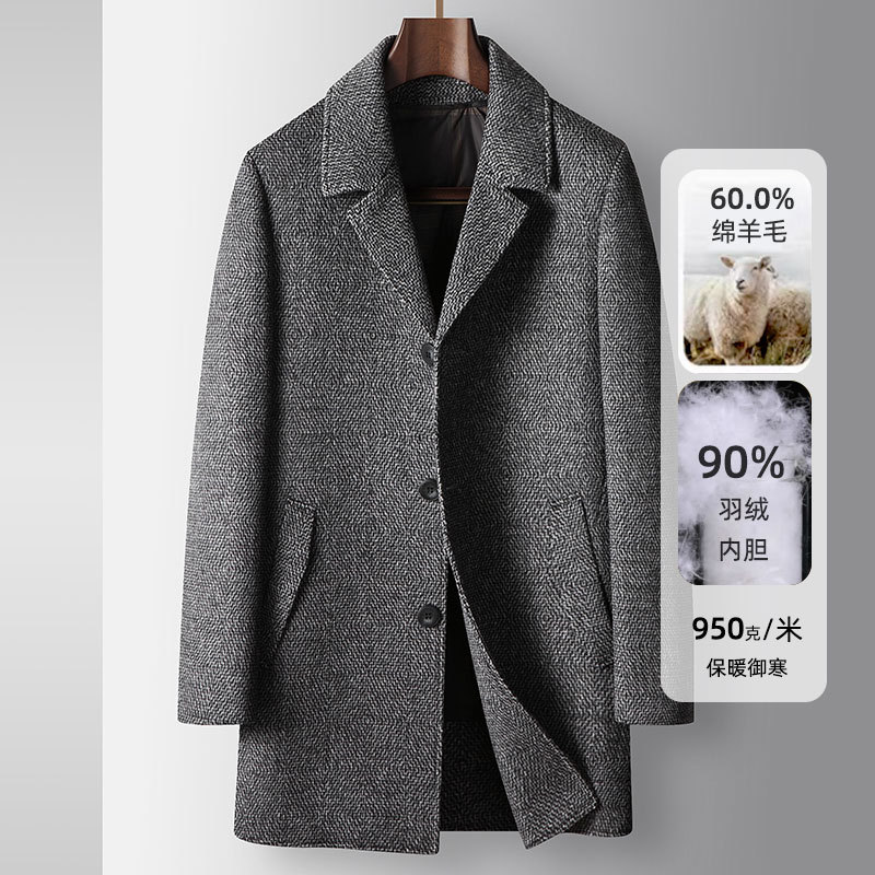 男性の毛のコートは2024秋冬の長いタイプの青年の軽豪華なビジネスはダウンの中の大胆なカジュアルなウールのコートを外します。