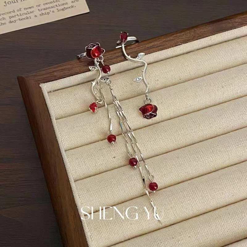 韓国系の赤いバラのフリンジピアスの非対称デザイン感があります。