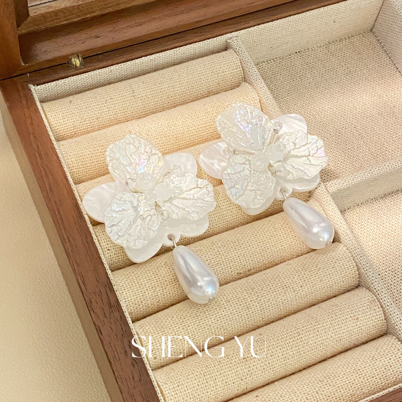 フランスの真珠の花のピアスは優しくて精巧で、甘いです。