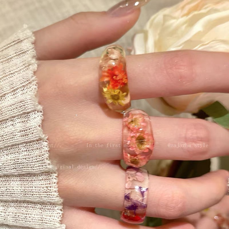 夏の新しいスタイルの造花ドライフラワー樹脂リング、新鮮で積み重ね可能なハイエンドのユニークで多用途な人差し指リング