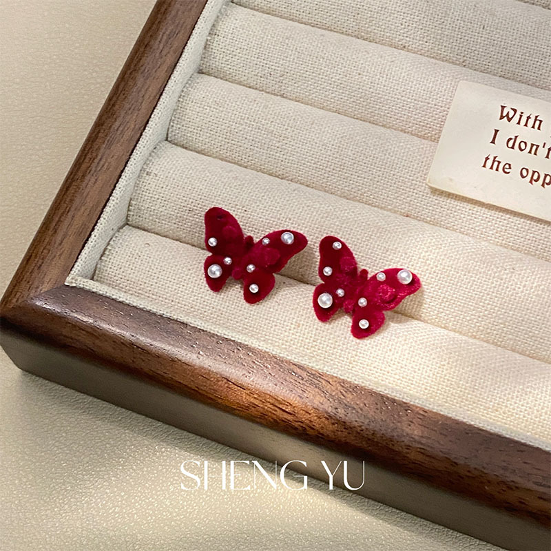新しい秋冬のレトロな赤い植毛の蝶結びのイヤリングのフランス式の優しい毛の高級な蝶の真珠のイヤリング