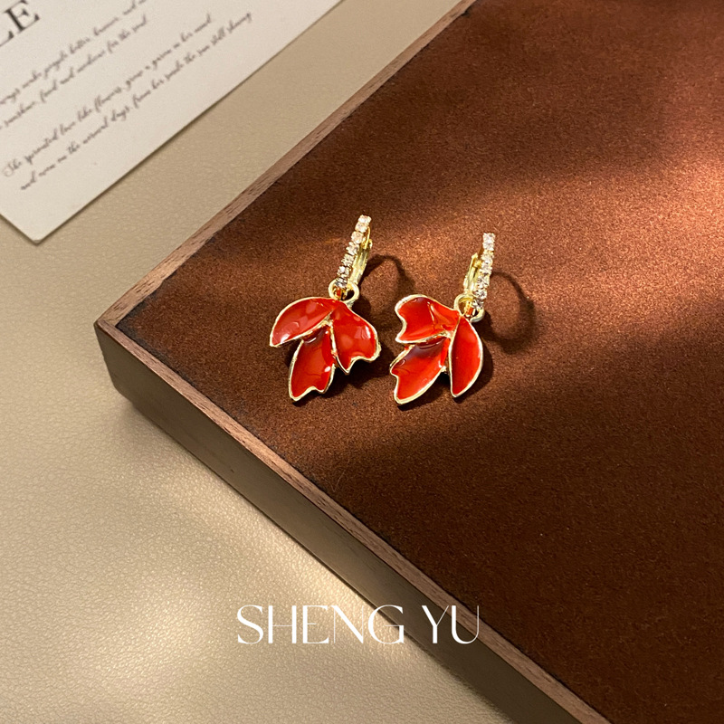 新年の正月の赤いレトロな木の葉のイヤリングの大衆のデザイン感の高級な軽さのピアスの気質の秋冬の耳飾りの女性