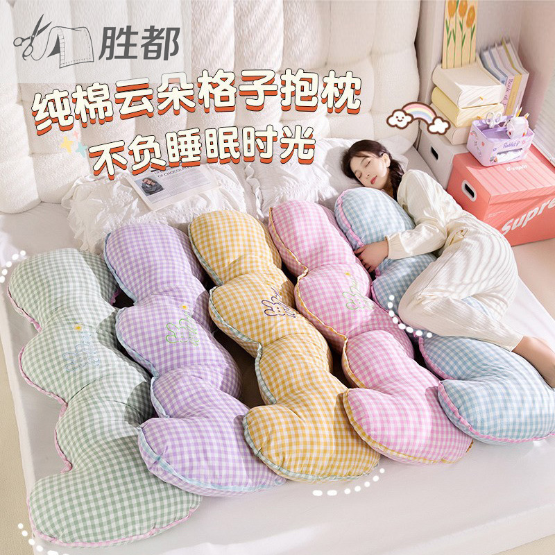 勝都長方形枕 純綿格子柄ウェーブ型脚枕 ベッドサイドクッション 妊婦用大型枕 横向き寝用抱き枕
