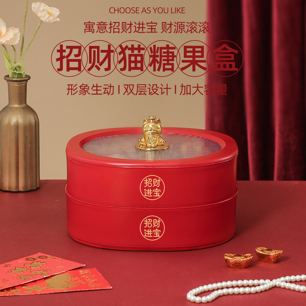 25年新しいキャンディボックス家庭用大容量PP二層蓋付きコンパートメントお祝い招き猫フルーツプレートスナックボックス