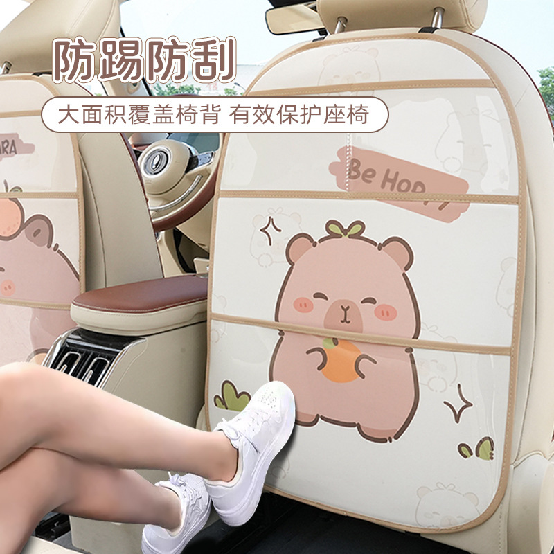 カピバラ車用キックマット、雑貨入れ、かわいい漫画風車載シートバック、革製、汚れにくい車用保護マット