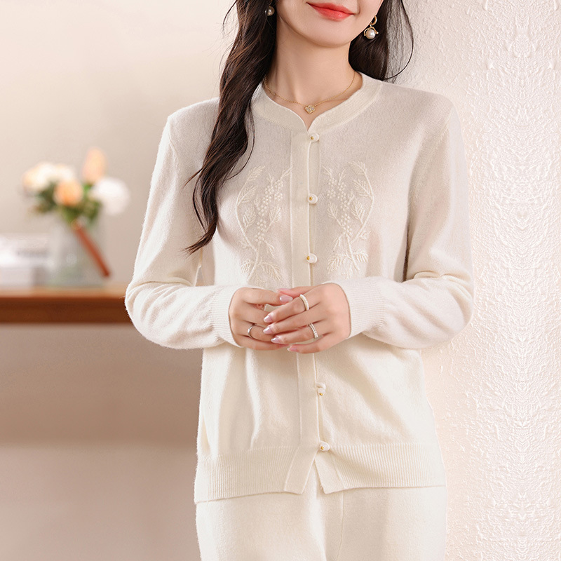 女性丸首ウールカーディガン国風盤ボタンコート女性ゆるい刺繍ニットセーターショート秋冬
