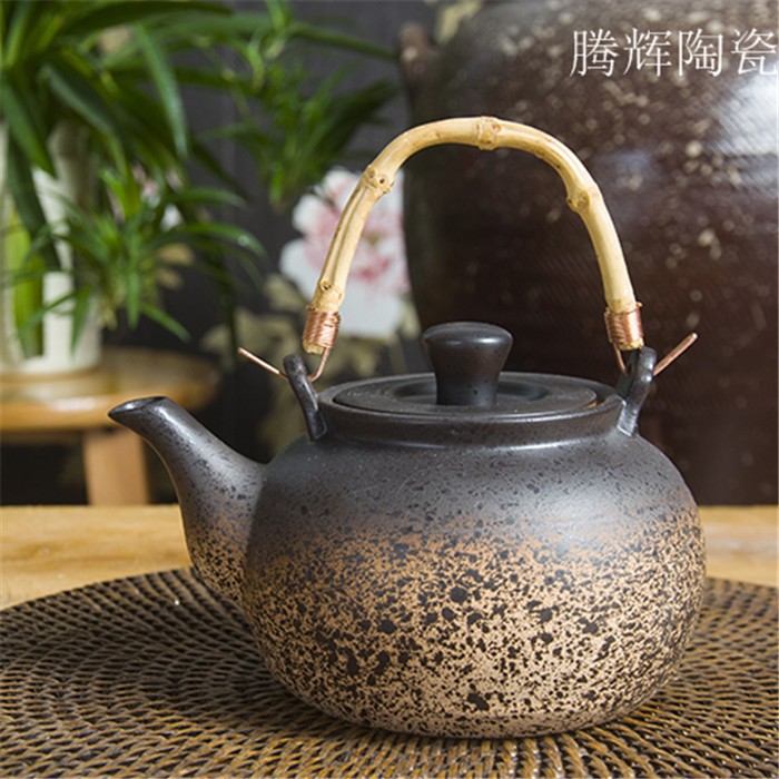 陶磁器の茶器黒茶はティーポットの側でティーポットの電気茶器を沸かします。