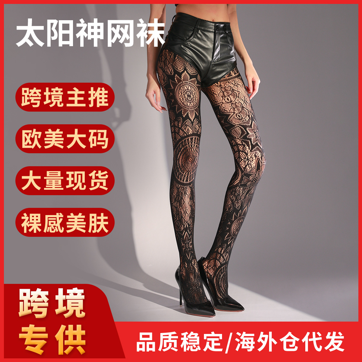 クロスボーダーレトロタトゥー風欧米セクシーブラック透かし模様ジャカードレギンス女性用足踏みソックス網タイツ